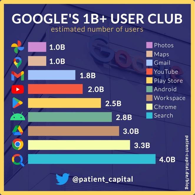 Y es en este punto donde se encuentra la verdadera ventaja de Google: su enorme ecosistema. El dato es muy simple (e inalcanzable para la competencia): Google cuenta con 9 servicios con más de 1bn de usuarios mensuales. Cabe resaltar que estos datos son de 2023, en la actualidad, el número de servicios con +1bn usuarios activos habrá aumentado con total seguridad: