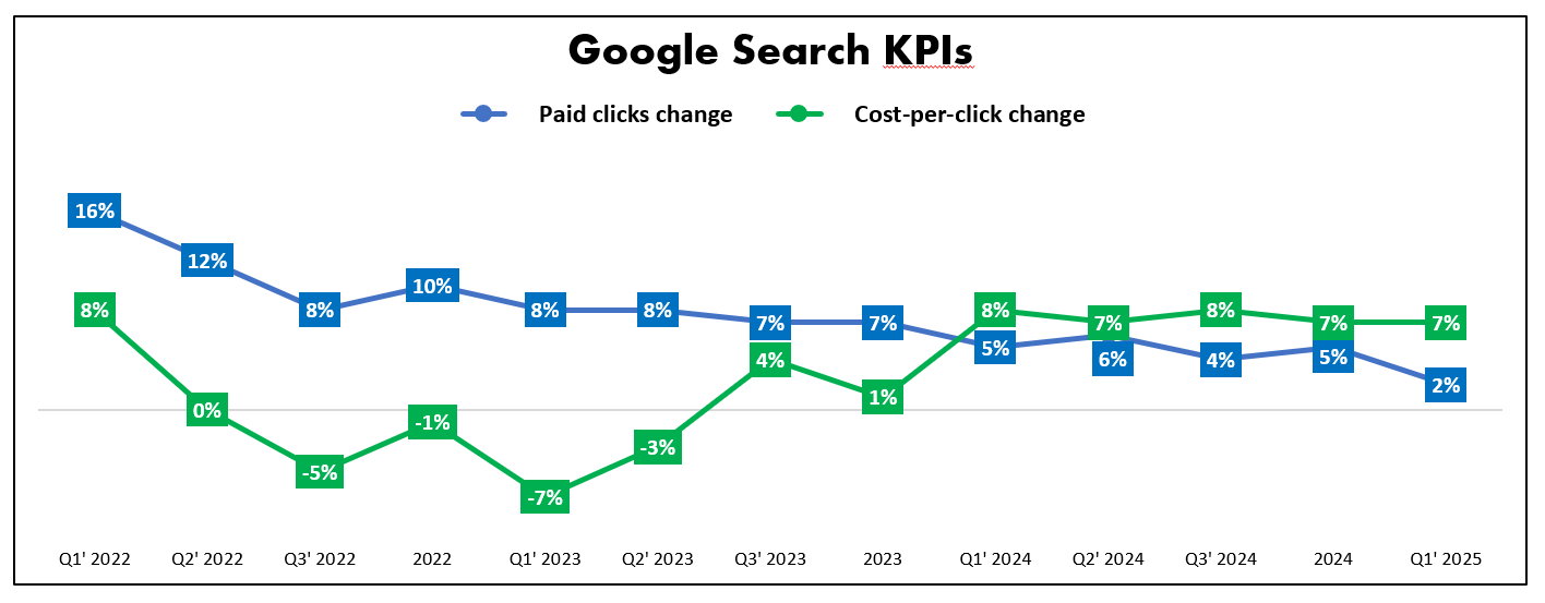 Como podemos comprobar, los “Paid clicks” se están desacelerando trimestralmente desde 2023. Esta es una de los argumentos que se utilizan para argumentar el fin de Google Search.