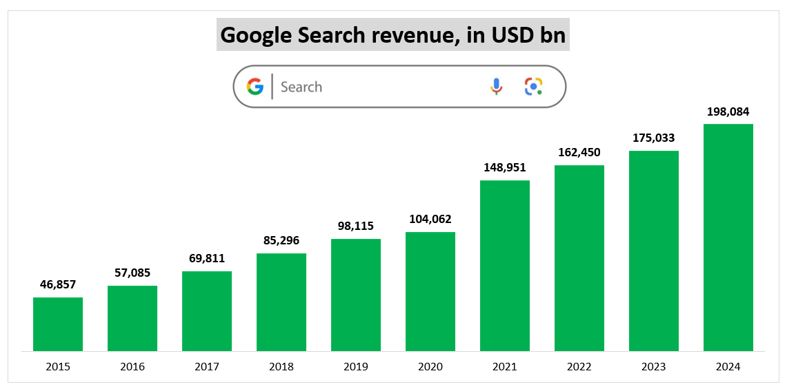 Google Search es la gallina de los huevos de oro de Alphabet, Inc (NDAQ:GOOGL). Se trata de la mayor empresa de publicidad del mundo con unos ingresos anuales de ~$200bn en 2024; y del mayor motor de búsqueda del mundo, con una cuota de mercado superior al 90%.