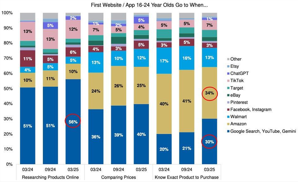 Como podemos comprobar en esta gráfica, los jóvenes están aumentando considerablemente el uso Google Search en todas sus categorías. Incluso le está robando cuota a Amazon en la categoría principal de esta plataforma, la de compra del producto exacto que se busca.